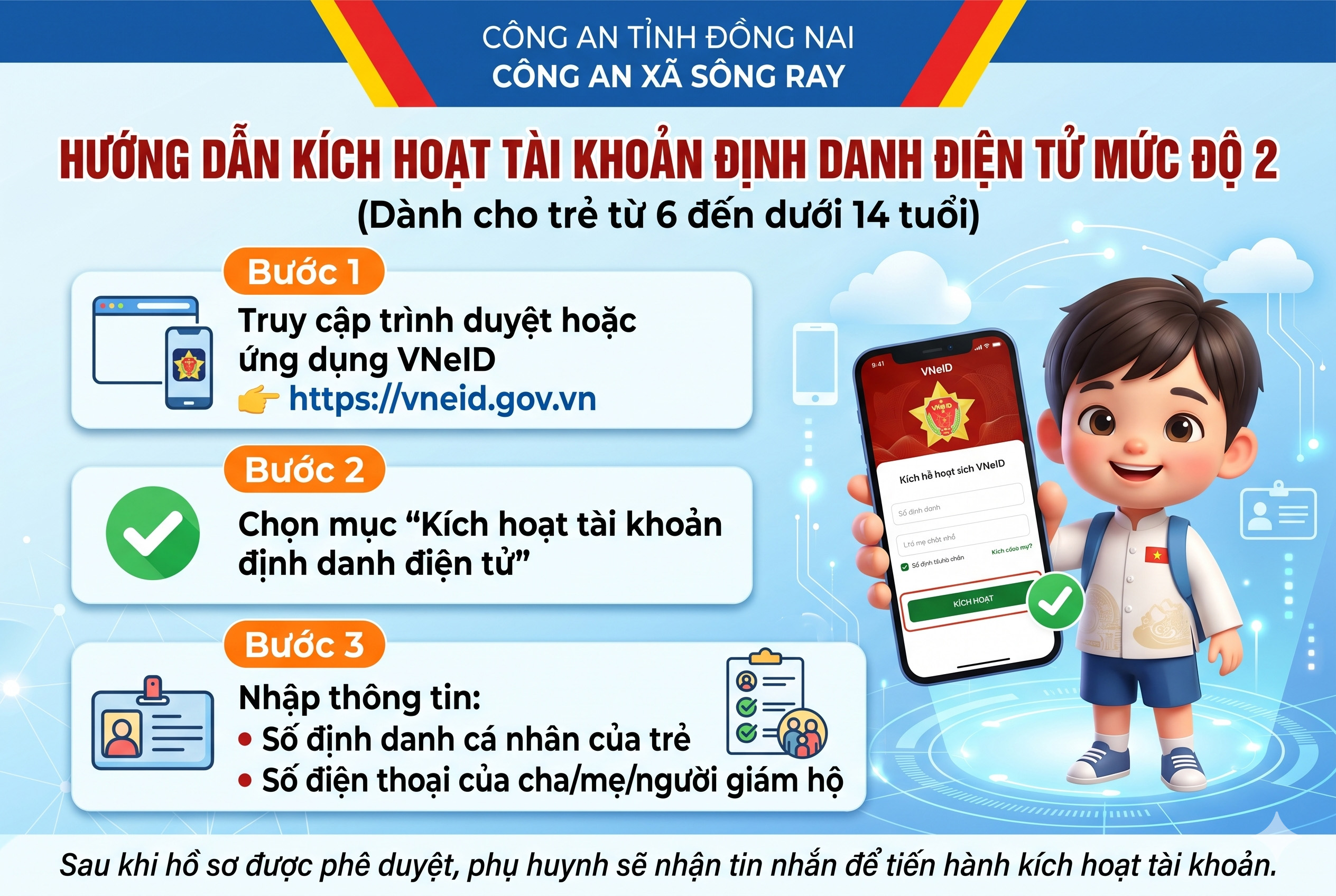 <p>Công an xã Sông Ray trân trọng thông báo đến Nhân dân trên địa bàn:</p><p>Hiện nay, hệ thống mạng phục vụ công tác cấp tài khoản định danh điện tử đã được khắc phục và xử lý hoàn tất, sớm hơn dự kiến. Công an xã tiếp tục triển khai thực hiện đăng ký, kích hoạt tài khoản định danh điện tử mức độ 2 cho trẻ em nhằm phục vụ nhu cầu quản lý và sử dụng các dịch vụ công trực tuyến.</p><h3><strong>1. Đối tượng thực hiện</strong></h3><p>Trẻ em từ đủ 06 tuổi đến dưới 14 tuổi đang cư trú trên địa bàn xã Sông Ray.</p><h3><strong>2. Thời gian thực hiện</strong></h3><p>Công an xã tổ chức tiếp nhận, xử lý hồ sơ tất cả các ngày trong tuần, kể cả ngày lễ, với các khung giờ cụ thể:</p><ul><li data-list-item-id="ee392a86886c9f552f9547533200575e0">Ca sáng: từ 07 giờ 00 đến 11 giờ 30</li><li data-list-item-id="e7afb56c99b5e97624ec16db156991ca9">Ca chiều: từ 13 giờ 30 đến 17 giờ 00</li><li data-list-item-id="e2bed727bf40445c3f3685d6156aafeb9">Ca tối: từ 19 giờ 00 đến 21 giờ 00</li></ul><p><i>Khuyến khích người dân sắp xếp thời gian đến làm vào ban ngày để tránh tình trạng quá tải vào buổi tối.</i></p><h3><strong>3. Địa điểm</strong></h3><p>Trụ sở Công an xã Sông Ray (Ấp 1, xã Sông Ray).</p><h3><strong>4. Hướng dẫn kích hoạt tài khoản định danh điện tử mức độ 2</strong></h3><p>Sau khi hoàn tất đăng ký tại cơ quan Công an và hồ sơ được phê duyệt, cha/mẹ hoặc người giám hộ sẽ nhận được tin nhắn thông báo. Khi đó, thực hiện kích hoạt tài khoản theo các bước sau:</p><ol><li data-list-item-id="e785c8744537453aaa22bde25e3a14988"><strong>Bước 1:</strong> Truy cập trình duyệt web (Google, Safari,…) và vào địa chỉ:&nbsp;<br /><a target="_blank" rel="noopener noreferrer" href="https://vneid.gov.vn">https://vneid.gov.vn</a> hoặc mở ứng dụng VNeID.</li><li data-list-item-id="e66425ef04a47344a1d64f0e559086dfd"><strong>Bước 2:</strong> Tại giao diện chính, chọn mục “Kích hoạt tài khoản định danh điện tử”.</li><li data-list-item-id="e2383747d42304d300fc7371f2f874df1"><strong>Bước 3:</strong> Nhập đầy đủ thông tin theo yêu cầu:<ul><li data-list-item-id="e6bde7f37a176bbbed8adf9209f7c2772">Số định danh cá nhân của trẻ</li><li data-list-item-id="e70ddb11f2ea1773a9cf4e7a415c138e0">Số điện thoại của cha/mẹ/người giám hộ đã đăng ký</li></ul></li></ol><figure class="image"><img style="aspect-ratio:2528/1696;" src="https://songray.dongnai.gov.vn/uploads/songray/news/2026_04/thong-bao-cax-2.jpg" width="2528" height="1696" /></figure><h3><strong>5. Tổ chức thực hiện</strong></h3><p>Công an xã Sông Ray đề nghị các bậc phụ huynh, người giám hộ chủ động sắp xếp thời gian, phối hợp cùng lực lượng Công an để hoàn thành thủ tục nhanh chóng, thuận tiện, góp phần đẩy mạnh chuyển đổi số trên địa bàn.</p><p>Mọi khó khăn, vướng mắc trong quá trình thực hiện, đề nghị liên hệ trực tiếp Công an xã Sông Ray để được hướng dẫn, hỗ trợ.</p><p style="text-align:right;"><strong>Công an xã Sông Ray trân trọng thông báo.</strong></p>