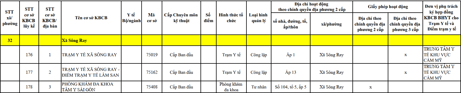 - UBND xã Sông Ray thông báo đến người dân trên địa bàn danh sách cơ sở khám chữa bệnh đủ điều kiện khám bệnh, chữa bệnh bảo hiểm y tế 2026 trên địa bàn xã Sông Ray (hình ảnh bên dưới)